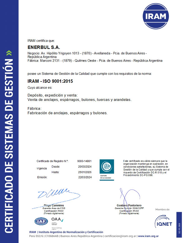 Enerbul es una empresa Metalúrgica pyme dedicada a la fabricación y distribución de bulonería. Mantiene las tradiciones familiares y las ha enriquecido a través de los años con la incorporación de personal profesional con experiencia en todas sus áreas, permitiendo crecer en un mercado cambiante y exigente. En Enerbul nos esforzamos por combinar el conocimiento y la tecnología para mejorar la calidad de nuestro trabajo y de los productos.