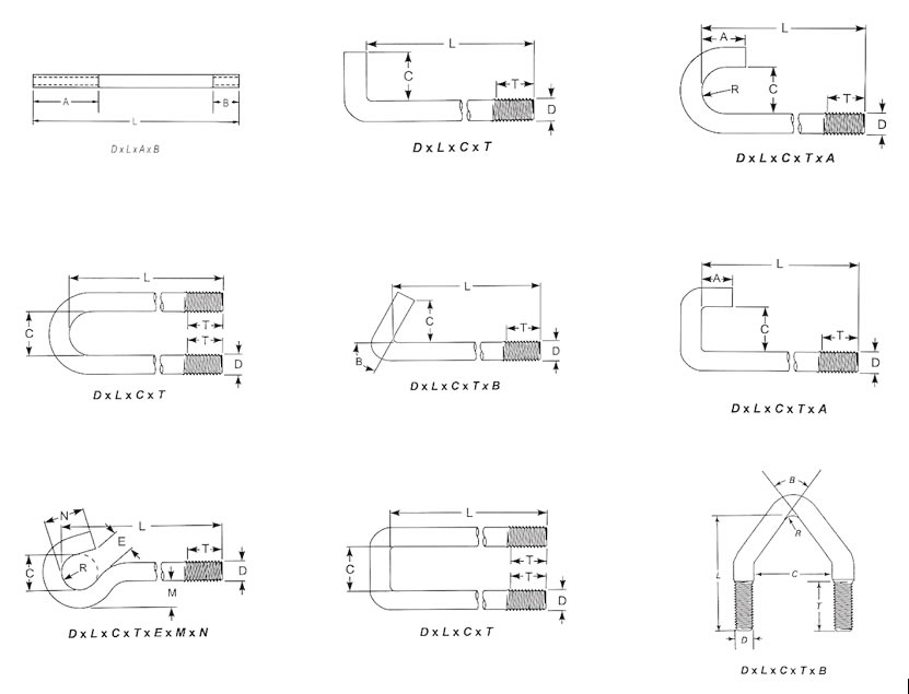 Anclajes rectos, en “L”, “J”, “U” y por diseño. Pueden incluir placas, tuercas y arandelas soldadas.