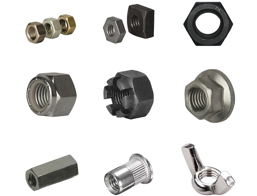 Tuercas hexagonales, pesadas, autofrenantes, con ala (flange), para uniones, abrazadera, castillo, almenadas, cónicas, para soldar, contratuercas, remache, mariposa y cuadradas.